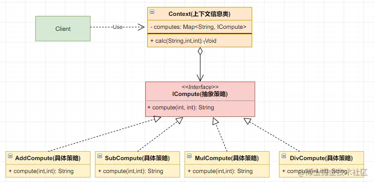 客户端:创建一个特定策略对象并传递给上下文。上下文则会提供一个设置器以便客户端在运行时替换相关联的策略。