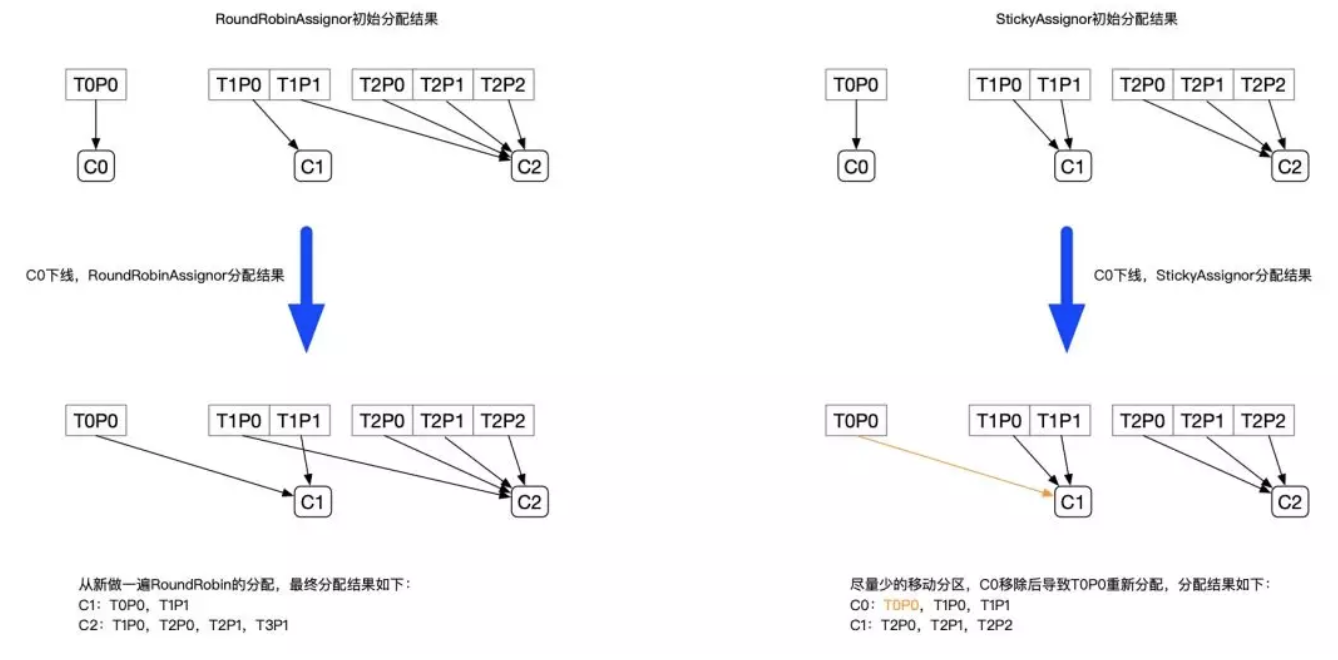 上面的例子中,Sticky 模式原来分配给 C0、C2 的分区都没有发生变动,且最终 C0、C1 达到的均衡的目的。