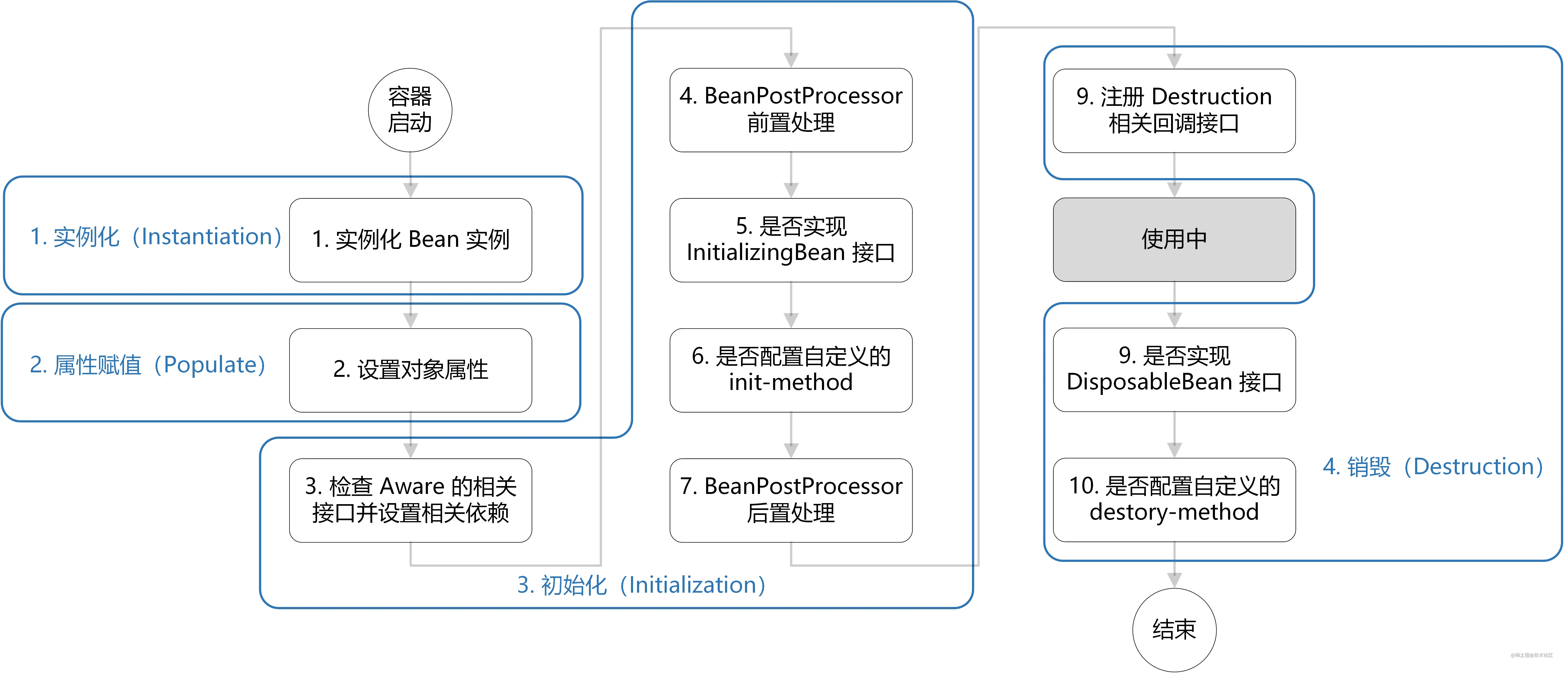 - 销毁:第 8~10 步,第 8 步不是真正意义上的销毁(还没使用呢),而是先在使用前注册了销毁的相关调用接口,为了后面第 9、10 步真正销毁 bean 时再执行相应的方法。