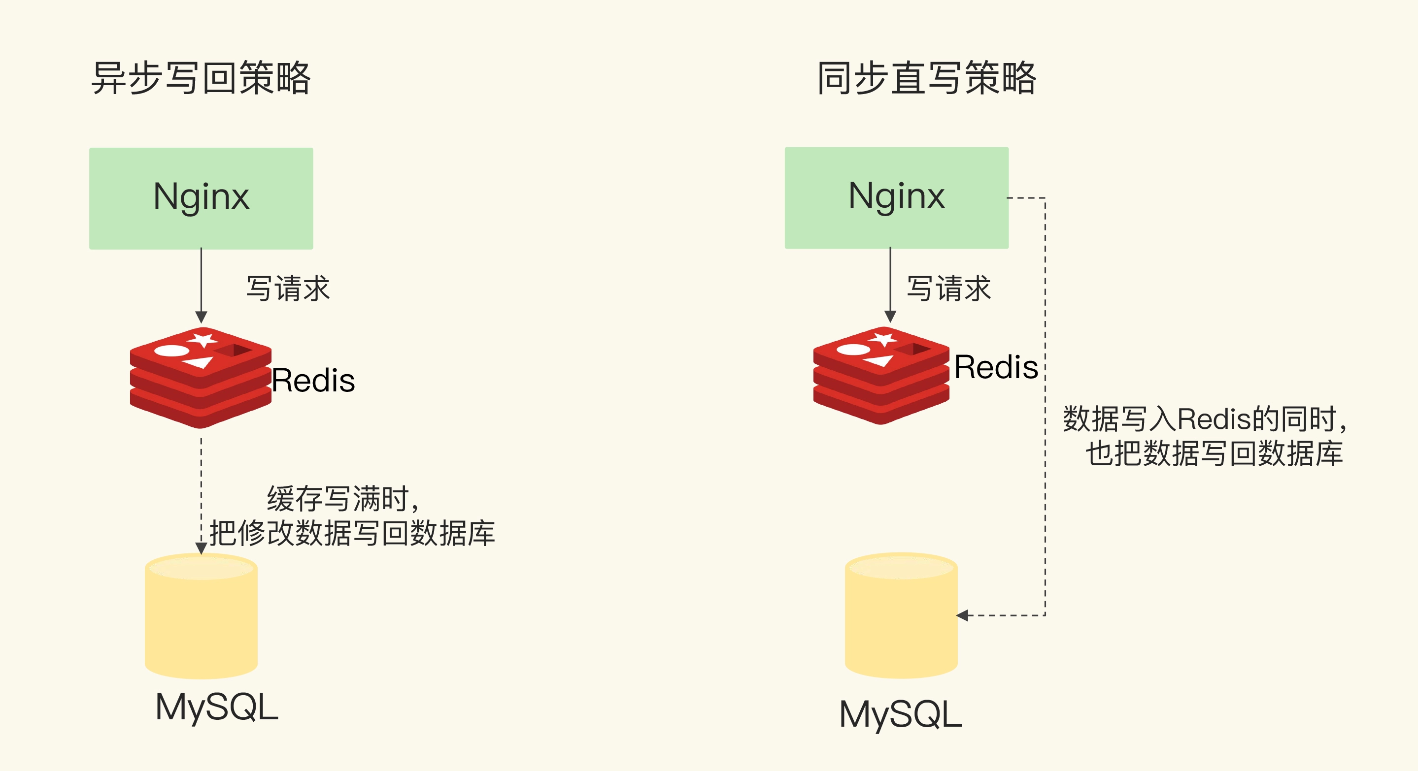 同步直写是指,写请求发给缓存的同时,也会发给后端数据库进行处理,等到缓存和数据库都写完数据,才给客户端返回。这样,即使缓存宕机或发生故障,最新的数据仍然保存在数据库中,这就提供了数据可靠性保证。