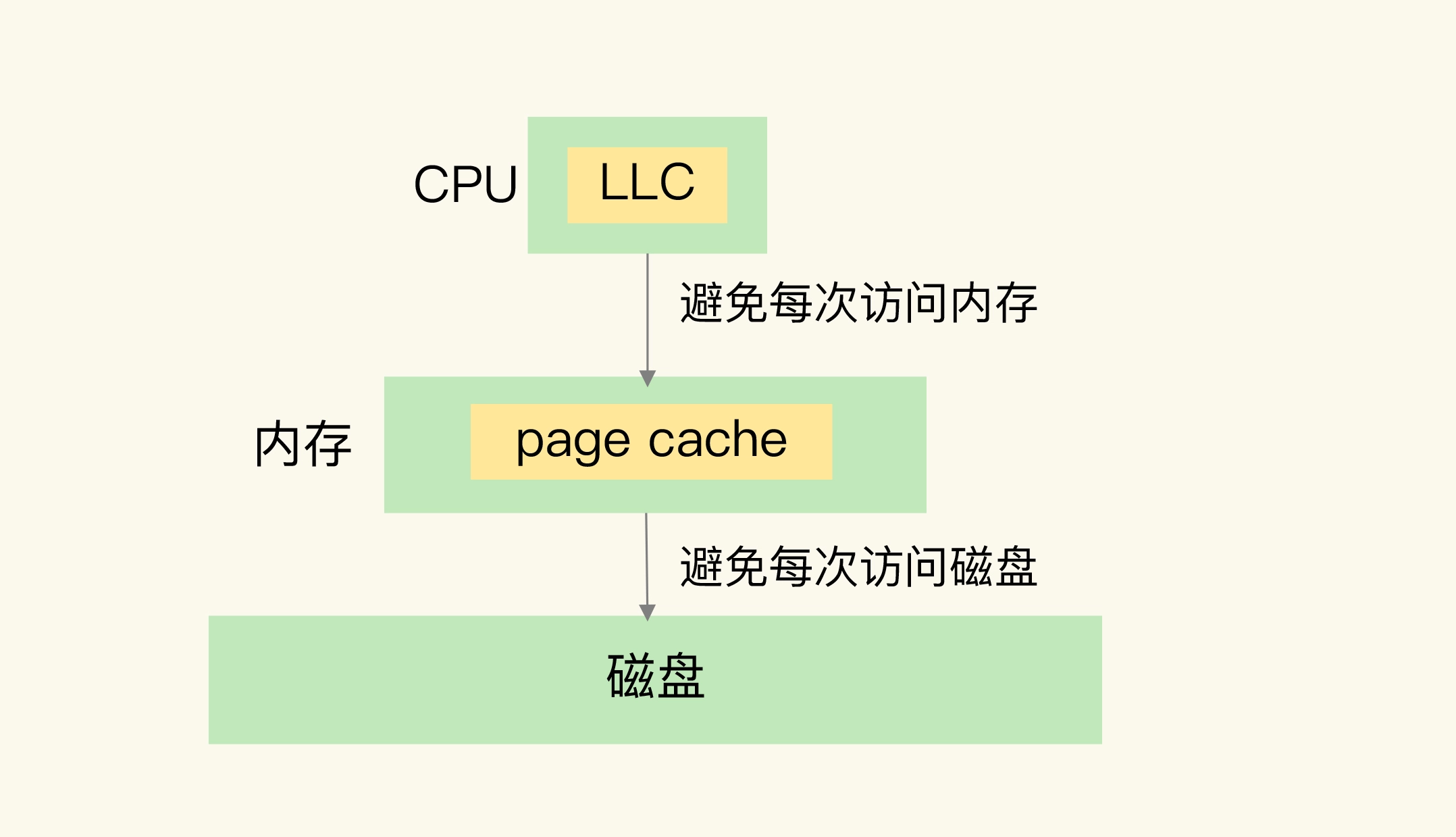 从图上可以看到,CPU、内存和磁盘这三层的访问速度从几十 ns 到 100ns,再到几 ms,性能的差异很大。